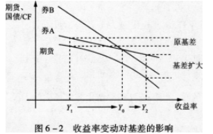 图10?1说明了收益率变动对基差的影响,期货的票面利率为y0,当前时刻收益为y1,券A的久期小于券B的久期。下列表述正确的有( )。