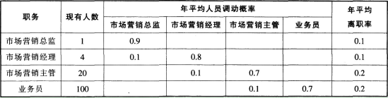 某企业根据人力资源需求与供给状况及相关资料。制定2017年人力资源总体规划和人员接续及升迁计划。经过调查研究,确认该企业的市场营销人员变动矩阵。如下表所示。