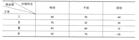 某企业开发新产品,有四种产品方案可供选择,四种方案在不同的市场状态下的损益值见下表,决策者采用折中原则进行决策,给定最大值系数a=0.75。则该企业应该选择的方案为()。